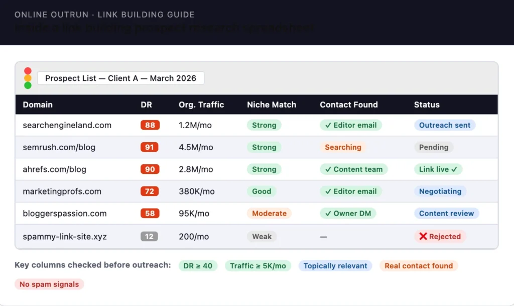 This is where the real legwork starts. The outreach team builds a list of websites that are topically relevant to your niche, active and regularly updated, within the agreed domain rating range, and free from spam signals. For each prospect, the team checks organic traffic not just DR (a high-DR site with zero traffic is a weak placement), looks at the site’s existing content quality, and confirms the site accepts editorial placements or guest posts. A typical campaign generates 50–200 qualified prospects per month, depending on niche and volume targets.